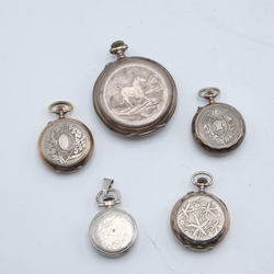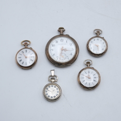 | Omschrijving | Lot van vijf horloges: een derde gehalte (800/1000) zilveren herenhorloge, gemerkt Kaiserstunde, drie derde gehalte (800/1000) zilveren dameszakhorloges, en een tweede gehalte (835/1000) zilveren horlogehanger, gemerkt Primato |