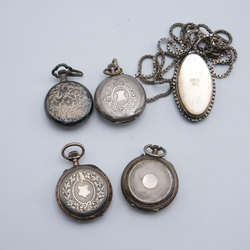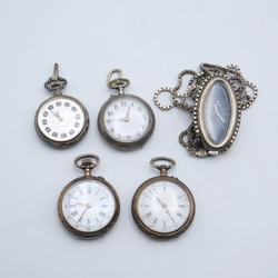 | Omschrijving | Lot van vier tweede (835/1000) en derde (800/1000) gehalte zilveren dameszakhorloges, met daarbij een eerste gehalte zilveren ovale hanger, Amdian, met geïntegreerd eerste gehalte zilveren collier |