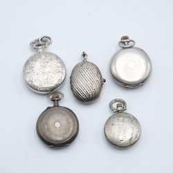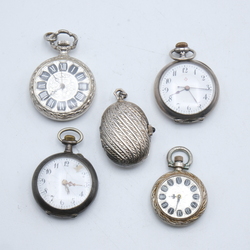 | Omschrijving | Lot van vijf dameshorloges, waaronder twee derde gehalte (800/1000) zilveren zakhorloges, een tweede gehalte (835/1000) zilveren hanger, gemerkt Lareine en twee hangers, gemerkt Commodoor & Royal |