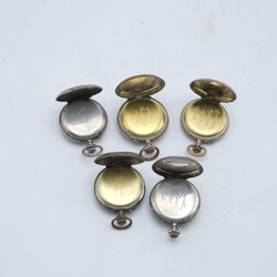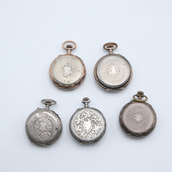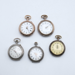 | Omschrijving | Lot van vijf antieke dameszakhorloges, ca. 1900, waaronder vier in derde gehalte (800/1000) zilveren kast |