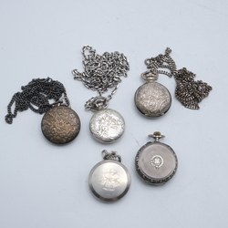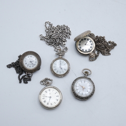 | Omschrijving | Lot van vijf eerste (925/1000), tweede (835/1000) en derde gehalte (800/1000) zilveren dameshorloges, aan zilveren horlogekettingen |