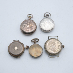| Omschrijving | Lot van vijf zilveren dameshorloges: twee tweede gehalte (835/1000) zilveren hangers, Marti & Lasita, en drie derde gehalte (800/1000) zilveren dameszakhorloges, twee omgebouwd tot polshorloges |