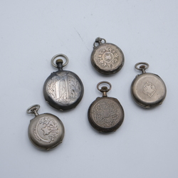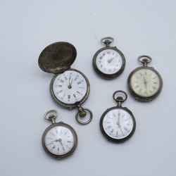 | Omschrijving | Lot van vijf antieke dameszakhorloges, allen in derde gehalte (800/1000) zilveren kast |