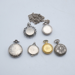 | Omschrijving | Lot van zes 20e eeuwse vergulde, tweede (835/1000) en derde (800/1000) gehalte dameshorloges, waaronder een aan tweede gehalte zilveren horlogeketting |