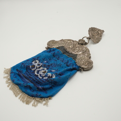 | Omschrijving | Een grote vroeg 19e eeuwse zilveren beursbeugel met gedreven decor van Bijbelse voorstellingen, aan zilveren rokhaak. |