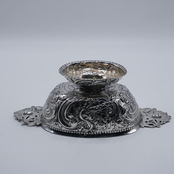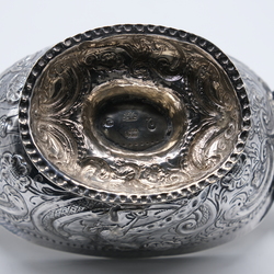 Zilveren brandewijnkom onder meer versierd met drijfwerk met pauwen, Sneek, anno 1791.