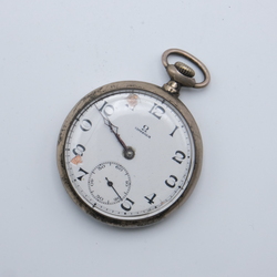 | Omschrijving | Een 20e eeuws derde gehalte (800/1000) zilveren zakhorloge, Omega, wijzerplaat met beschadigingen |
