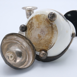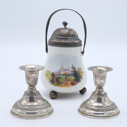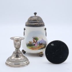 | Omschrijving | Een antiek 19e eeuws porseleinen zwavelstokpotje met landschapsecor en tweede gehalte (835/1000) zilveren deksel en handvat. Met daarbij twee 20e eeuwse eerste gehalte (925/1000) zilveren kandelaars. |