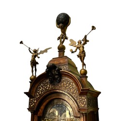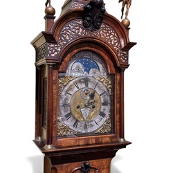 | Omschrijving | Een antiek 18e eeuws Amsterdams staand horloge in wortelnoten gefineerde eikenhouten kast, geplaatst op bolpoten. Met geprofileerde kap, bekroond met drie grote uit hout gestoken en gepolychromeerde sculpturen, Atlas en twee blazoenblazende engelen. De wijzerplaat voorzien van maand- en dagaanduiding, maanstand, graveerwerk van o.a. een driemaster en naam Jan Christoffel Sauer, werkzaam als klokkenmaker in Amsterdam rond 1770-1780. |