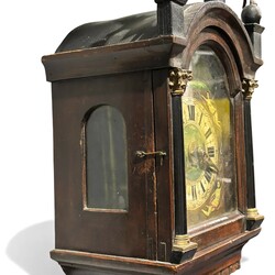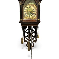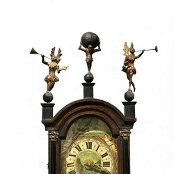 | Omschrijving | Een antiek 19e eeuws Fries staartschippertje. Eikenhouten kast, opengewerkte staart met rozet. Polychroom beschilderde wijzerplaat met Romeinse cijferaanduiding, aan de bovenzijde met schepen op het water. Met wekkermechanisme, kast bekroond met Atlas en twee blazoenblazende engelen. |