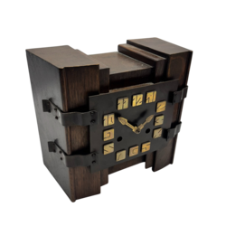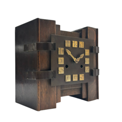 | Omschrijving | Een jaren '30 eikenhouten en koperen Amsterdamse School pendule. Vierkante wijzerplaat met Romeinse cijferaanduiding, achtdaags uurwerk met bel. |