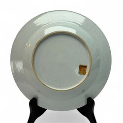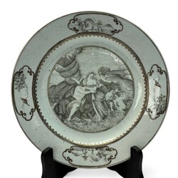 | Omschrijving | Een antiek 18e eeuws Chinees porseleinen bord Qianlong periode (1735-1796). Chine de Commande, met encre de chine grisaille decor met mythologische voorstelling op het plat: voorstelling van de Griekse goden Zeus en Hera, omringd door een adelaar, pauw en twee putti. De rand met vier medaillons met vogels en landschappen. |