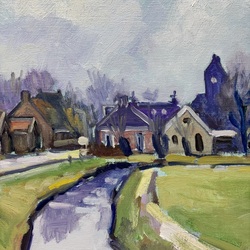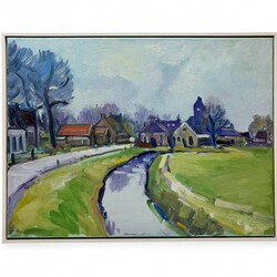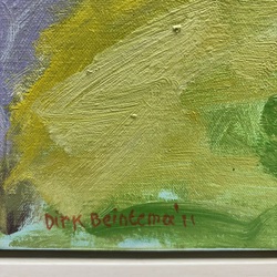 | Omschrijving | Schilderij, olieverf op doek. Gezicht op Swichum. Linksonder gesigneerd Dirk Beintema (Leeuwarden, 1948), gedateerd 2011. In witte baklijst. |