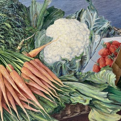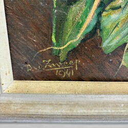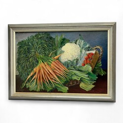 | Omschrijving | Schilderij, olieverf op doek. Stilleven met groente en fruit, onder andere wortels, broccoli en aarbeiden, in een mandje. mandje met groente en fruit', Linksonder gesigneerd Douwe van der Zweep (Utrecht 1890-1975), gedateerd 1941. |