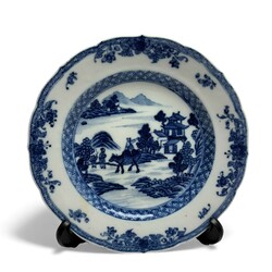 | Omschrijving | Lot van drie 18e eeuwse Chinees porseleinen borden, Qianlong periode (1735-1796). Met onderglazuur blauw-wit decor van een landschap met rotsen, bomen, pagodes, een jongetje op een os en twee andere figuren. |