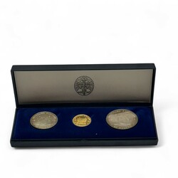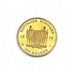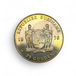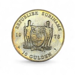 | Omschrijving | Complete muntset uit Suriname, bestaande uit de zilveren 10 gulden, 25 gulden (in 925/1000) en gouden 100 gulden (in 21,6 karaats, 900/1000), geslagen door de Koninklijke Nederlandse Munt (Rijks Munt). De munten tonen het wapen van Suriname en zijn uitgegeven in 1976 ter gelegenheid van de onafhankelijkheid. In cassette. |