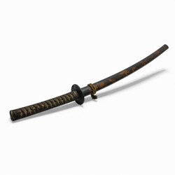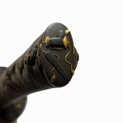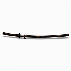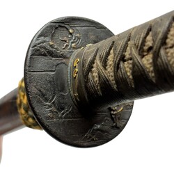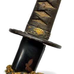| Omschrijving | Een antieke Japanse Kantana in een lakwerk op houten schede. Greep van roggehuid en met bronzen Tsjuba, Menuki en Kashira versierd met goud en zilver op en inleg, zgn damascene "mixed metalls". Meiji periode, ca 1900. |
