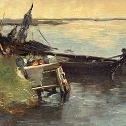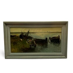 | Omschrijving | Schilderij, olieverf op paneel. Roeiboten en vissersfuiken aan de waterkant. Linksonder gesigneerd Egnatius Ydema (Wymbritseradiel 1876 – Voorburg 1937) |