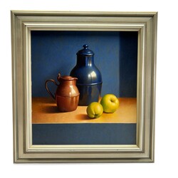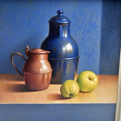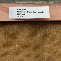 | Omschrijving | Schilderij, olieverf op paneel. Stilleven met bruine en blauwe emaille kan en twee appels. Linksonder gesigneerd Epko Cordel (Bolsward, 1957), gedateerd 1989. |