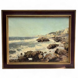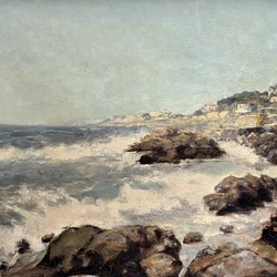 | Omschrijving | Schilderij, olieverf op doek. Kustlijn bij Tanger. Rechtsonder gesigneerd Fedor van Kregten (Diever 1871 - Den Haag 1937). In zwarte profiellijst met goudkleurige randen. |