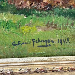 | Omschrijving | Schilderij, olieverf op doek. Hollands polderlandschap met o.a. hooibult, eenden en kerkje op de achtergrond. Rechtsonder gesigneerd Gerbrand Frederik van Schagen (The Hague 1880 - Laren 1968), gedateerd 1943. In fraaie profiellijst. Herkomst: vermoedelijk Christie's Amsterdam, 23 september 1986, lot 187 (Als 'Hamlet with Haystacks by a River (1943) 55.5 x 111 cm'). |