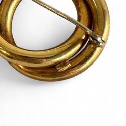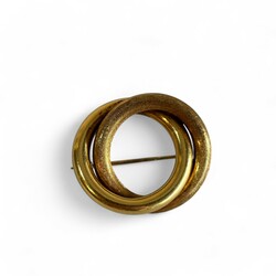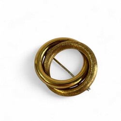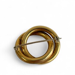 | Omschrijving | Een 20e eeuwse 18 karaats (750/1000) geelgouden broche, bestaande uit twee in elkaar gevlochten cirkels, één gematteerd. Vermoedelijk Italiaans, op de speld en broche gekeurd ‘750’. |