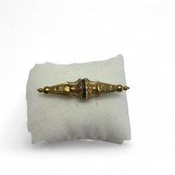 | Omschrijving | Een antieke 14 karaats (585/1000) geelgouden broche, gemaakt van twee antieke gegraveerde breipendoppen. Gemerkt met eikenblaadje. |