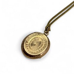 | Omschrijving | Een 20e eeuws 14 karaats (585/1000) geelgouden collier, met daaraan een antiek 19e eeuws gouden medaillon, ovaal model, aan de voor- en achterzijde gegraveerd. |