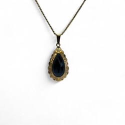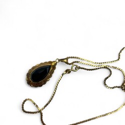 | Omschrijving | Een 20e eeuws 14 karaats (585/1000) geelgouden hanger, met geschulpte en gegraveerde rand, centraal bezet met een druppelvormige, gefacetteerde granaat. Gemerkt met modern eikenblaadje. Aan een 14 karaats (585/1000) geelgouden collier, gemerkt ‘585’. |