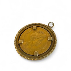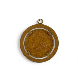 | Omschrijving | Een Gouden Vijfje, Wilhelmina 1912, gezet in een 14 karaats (585/1000) geelgouden montuur, gemerkt met oud eikenblaadje op het oogje. |