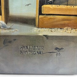| Omschrijving | Schilderij, olieverf op paneel. Trompe l'oeil met vogelkooitjes, titel ‘vogelmarkt’. Middenonder gesigneerd Hans Peter Nagtegaal (Amsterdam, 1944), gedateerd 1996. |