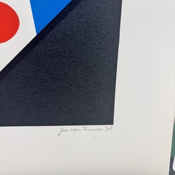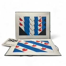 | Omschrijving | Een 20e eeuwse map, 'Friese vlag Projekt', met daarin zes zeefdrukken. Alleen geïnspireerd op de Friese vlag, door Jan van Tuinen (Sneek 1944-2012), 1978. Met daarbij één zeefdruk gelijst. |
