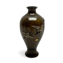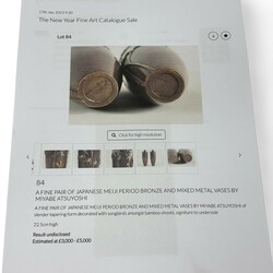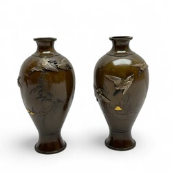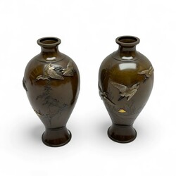 | Omschrijving | MIYABE ATSUYOSHI. Een passend stel Japans gepatineerde bronzen vazen met goud, zilver en koper opgelegd. Met een decor van zes vliegende kraanvogels in landschap. Beide vazen gesigneerd aan de onderzijde voor Meester werkplaats Dia Nihon Kyoyo ju ikkodo Miyabe Atsuyoshi. Meiji periode, ca 1890. |