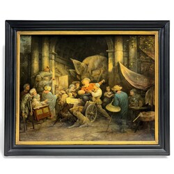 | Omschrijving | Schilderij olieverf op doek. De wonderheler. Voorstelling van een interieur met diverse mensen, kinderen en hondekar Gesigneerd RO Otto de Boer 1832. Gelijst. |