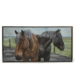| Omschrijving | Schilderij, olieverf op doek. Voorstelling van twee Belgische paarden, linksonder gemonogrammeerd ‘RHA’ = Rein Halbersma (Leeuwarden 1949 - Kollum 2021). In zwarte en zilverkleurige baklijst. |