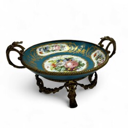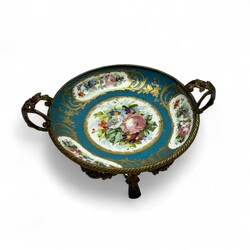 | Omschrijving | Een antieke 19e eeuwse Franse handbeschilderde schaal, lichtblauwe achtergrond, met vergulde decoratie en florale motieven. In verguld bronzen montuur op vier pootjes, verbonden met guirlandes. Aan de onderzijde gemerkt Sèvres. |