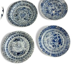 | Omschrijving | Lot van tien 19e eeuwse Chinees porseleinen kopjes en 20 schoteltjes, Jiaqing periode (1796-1820). Allen Kangxi revival stijl, met onderglazuur blauw-wit decor van vissen en krabben en bloemmotieven (zgn. ‘krab en baars decor’), kopjes aan de onderzijde gemerkt met vierkaraktermerk. Twee kopjes en schotels met licht afwijkend decor. |