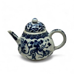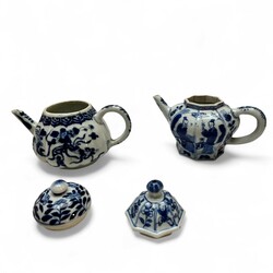 | Omschrijving | Lot van twee antieke Chinees porseleinen theepotjes met onderglazuur blauw decor, Kangxi periode (1664-1722). Eén achtkantig model met decor van lijzen rondom en zotjes op de deksel en één pompoenvormig theepotje met floraal decor. |