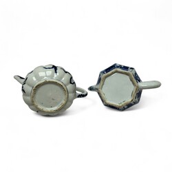 | Conditie | Achtkantig theepotje met chip aan de tuit, verder in goede staat. Pompoenvormig theepot met grote chip aan de tuit en twee fikse haarlijnen bij het oor en de tuit. Beide deksels mogelijk niet bijpassend. |