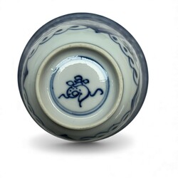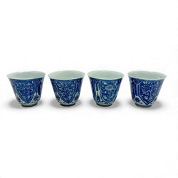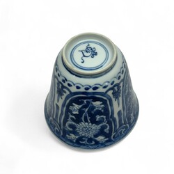 | Omschrijving | Lot van vier antieke hoge 18e eeuwse Chinees porseleinen koppen met onderglazuur blauw-wit floraal decor. Kangxi periode (1664-1722), aan de onderzijde gemerkt. |