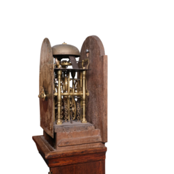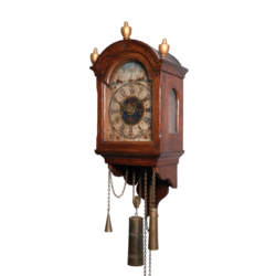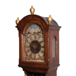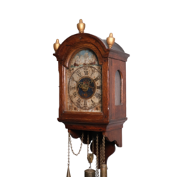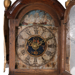 | Omschrijving | Een antiek laat 18e eeuws of froeg 19e eeuws Fries staartschippertje. Eikenhouten kast, polychroom beschilderde wijzerplaat met Romeinse en Arabische cijferaanduiding, aan de bovenzijde met schepen op het water. Met wekkermechanisme, kast bekroond met drie tollen. |