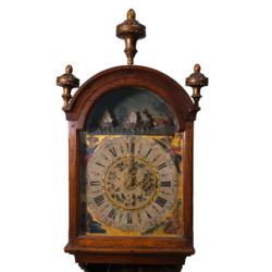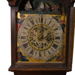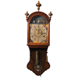 | Omschrijving | Een antieke 18e eeuwse Friese kortstaartklok in iepenhouten kast. Wijzerplaat met Romeinse en Arabische cijferaanduiding, omringd door verguldsel en de vier jaargetijden, aan de bovenzijde met mechaniek van scheepjes, golven en visser. Op de achterzijde van het achterplaatje gemonogrammeerd 'GA', wat zou kunnen wijzen op de klokkenmaker Geert Ales (Heerenveen) of Gerben Ates (klokkenmaker te Joure). Ca. 1790. |