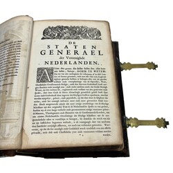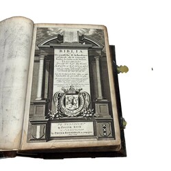 | Omschrijving | Een antieke Statenbijbel in lederen boekband en bronzen sloten, ‘Biblia dat is De Gantsche H. Schrifture’, door Pieter Keur, Dordrecht en Pieter Rotterdam, Amsterdam, 1716. Met wereldkaart kaart ‘Veertich-Iarige reyse’, ‘Jerusalem’, ‘Swarte See’, ‘het beloofde land Canaan’ en diverse uitvouwbare kopergravures met 16 verschillende voorstellingen. |