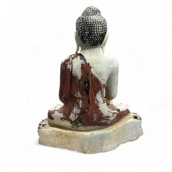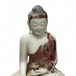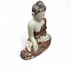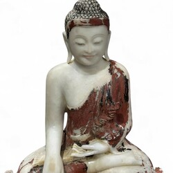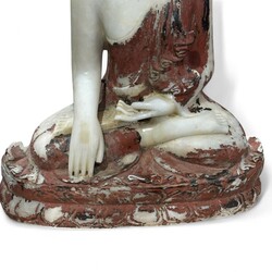 | Omschrijving | Een antieke 19e eeuwse grote albasten sculptuur, vooorstelling van Mandalay Boeddha, Mandalay, zittend op een lotustroon met Bhumisparsha Mudra handgebaar, vermoedelijk Birma, 19e eeuw. |
