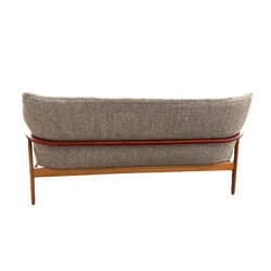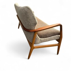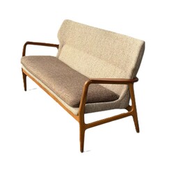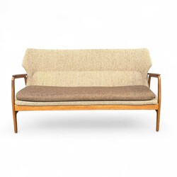 | Omschrijving | Een 20e eeuwse driezits bank met stoffen bekleding en gebogen teakhouten frame, ontwerp Aksel Bender Madsen voor Bovenkamp, ca. 1960. |