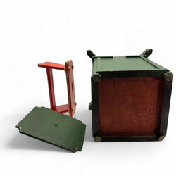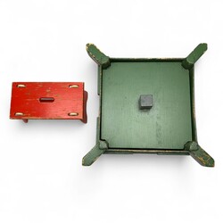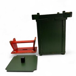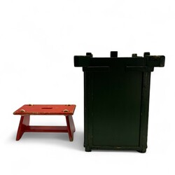 | Omschrijving | Rood houten krukje / speelgoedwagentje, en een groenbeschilderde Amsterdamse School prullenmand. Beide ontwerp & uitvoering Berend Tobia Boeyinga (Noord-Scharwoude 1886 – Amsterdam 1969), ca. 1920. Herkomst: familie van de architect |