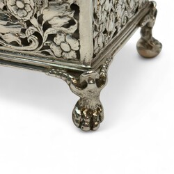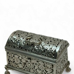 | Omschrijving | Antiek zilveren knottenkistje met opengewerkt decor |