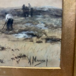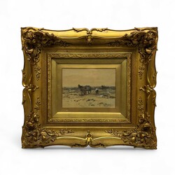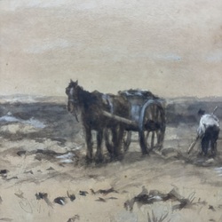 | Omschrijving | Aquarel/gouache op papier, voorstelling van een zandafgraving met paard en wagen. Gesigneerd Anton Mauve (1838-1888). In een originele, vergulde lijst achter glas. |