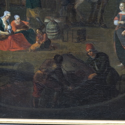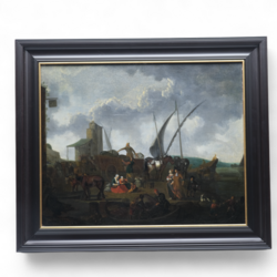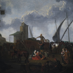 | Omschrijving | Schilderij, olieverf op doek/paneel. "Haven met o.a. stuwadoren" (‘A Mediterranean harbour with stevedores unloading and elegant company’. Onduidelijk gesigneerd met monogram (middenonder). Herkomst: Christie’s