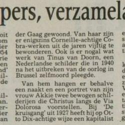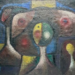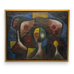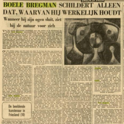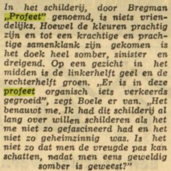| Omschrijving | Schilderij, olieverf op doek. Titel ‘De Profeet’, door Boele Bregman (Aengwirden 1918 – Heerenveen 1980). Literatuur: overzichtscatalogus Boele Bregman 1918-1980, museum Willem van Haren 1988, pagina 43. “In het schilderij door Bregman “profeet” genoemd, is niets vriendelijks. Hoewel de kleurig prachtig zijn en tot een krachtige en prachtige samenklank zijn gekomen is het doek heel somber, sinister en dreigend. Op een gezicht in het midden is de linkerhelft geel en de rechterhelft groen. “Er is in deze profeet organisch iets verkeerds gegroeid” zegt Boele er van. “Het benauwt me. Ik had het schilderij al lang over willen schilderen als het me niet zo gefascineerd had en het niet zo geheimzinnig was. Is het niet zo dat men de vreugde pas kan schatten, nadat men eens geweldig somber is geweest?” (Leeuwarder Courant, 27-05-1961) |
